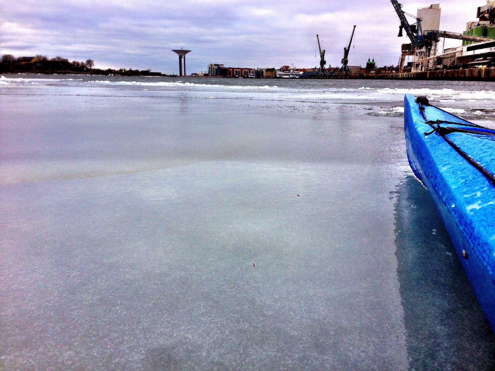 Minusgrader och vind från sydost. Drar kajaken genom lågvatten och issörja medans de hundratals sothönsen drar sig längre ut. På öppet vatten börjar vågorna att skölja över kajaken och sakta bygga upp ett ispansar på kajaken.