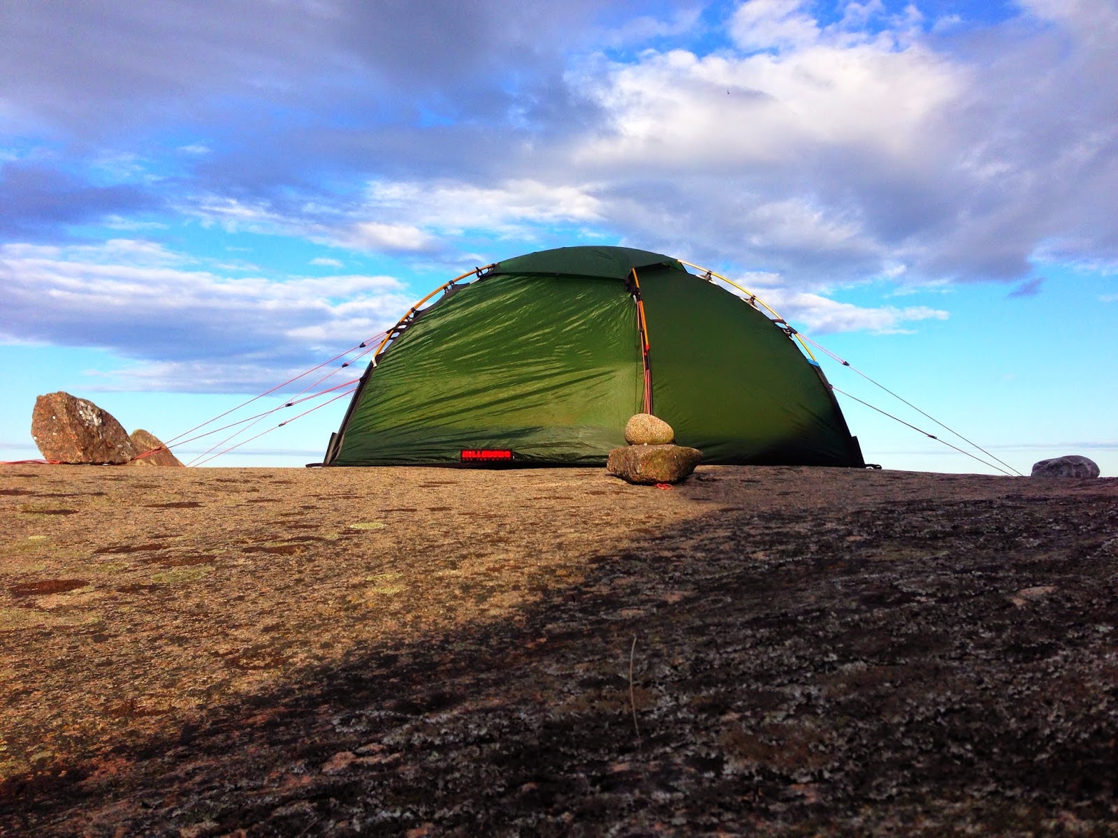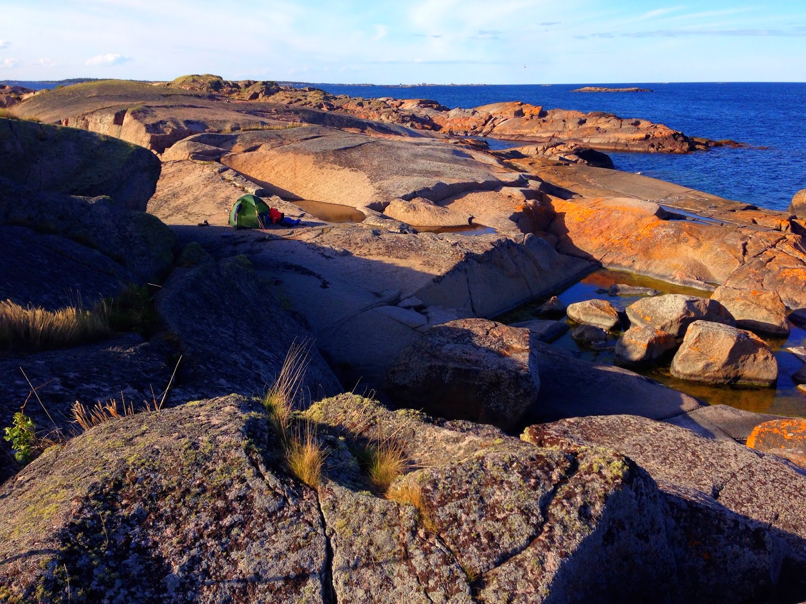 Tältet reses på en perfekt plats, lä från de kraftigaste vindarna, stadig grund och milsvid utsikt över öppet hav.