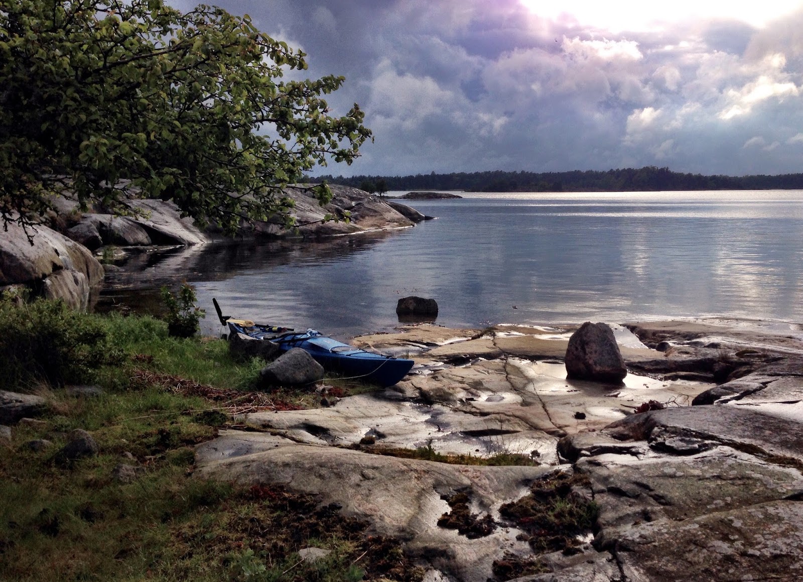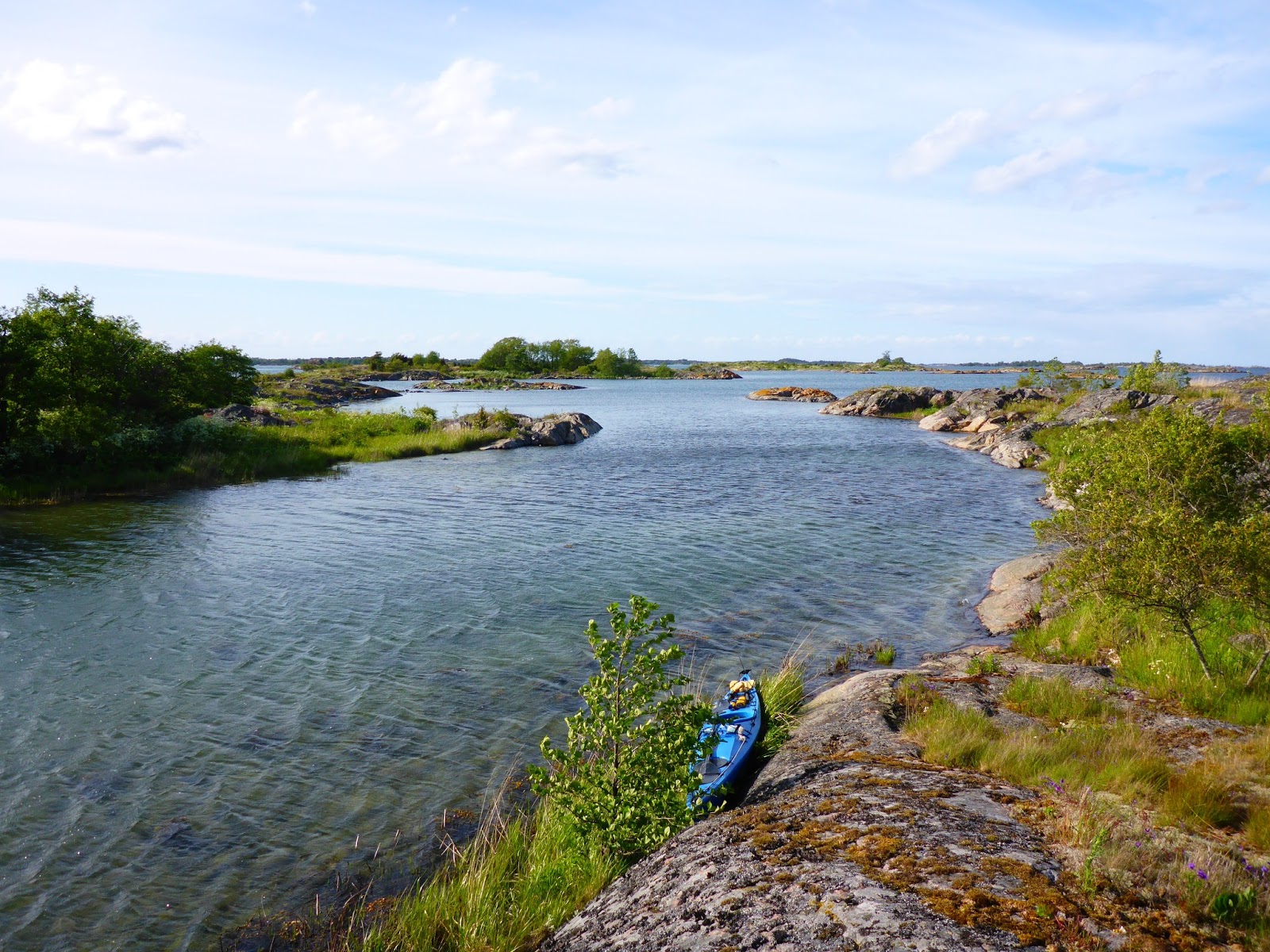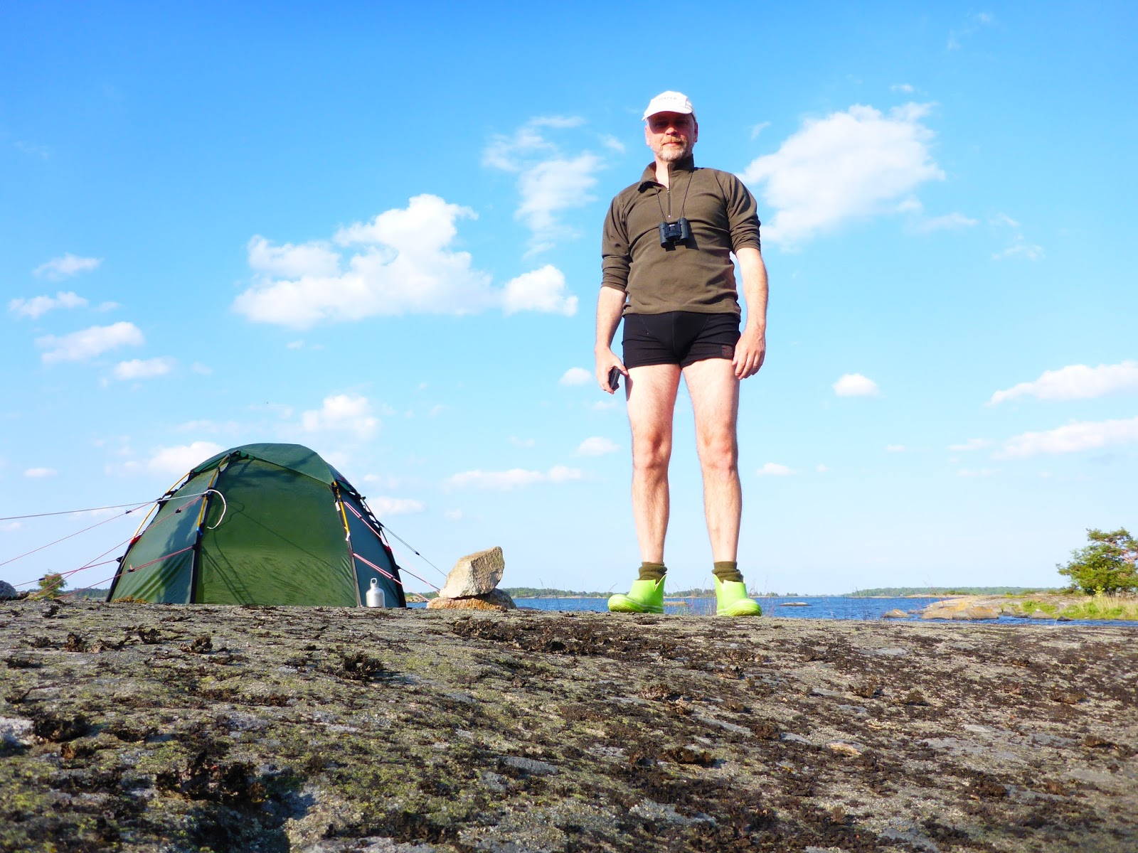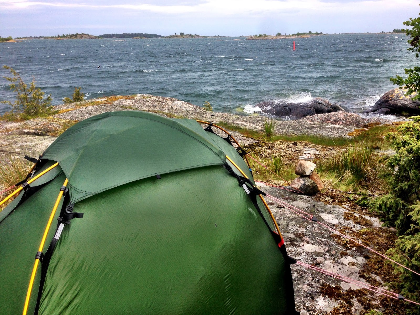 När gäspningarna kommer tätare kryper jag ändå in i tältet, som står en meter från havsytan, och när jag till slut ligger, med sovsäcken som täcke, slår det mig att detta blir den 19:e natten i tält denna semester 🙂