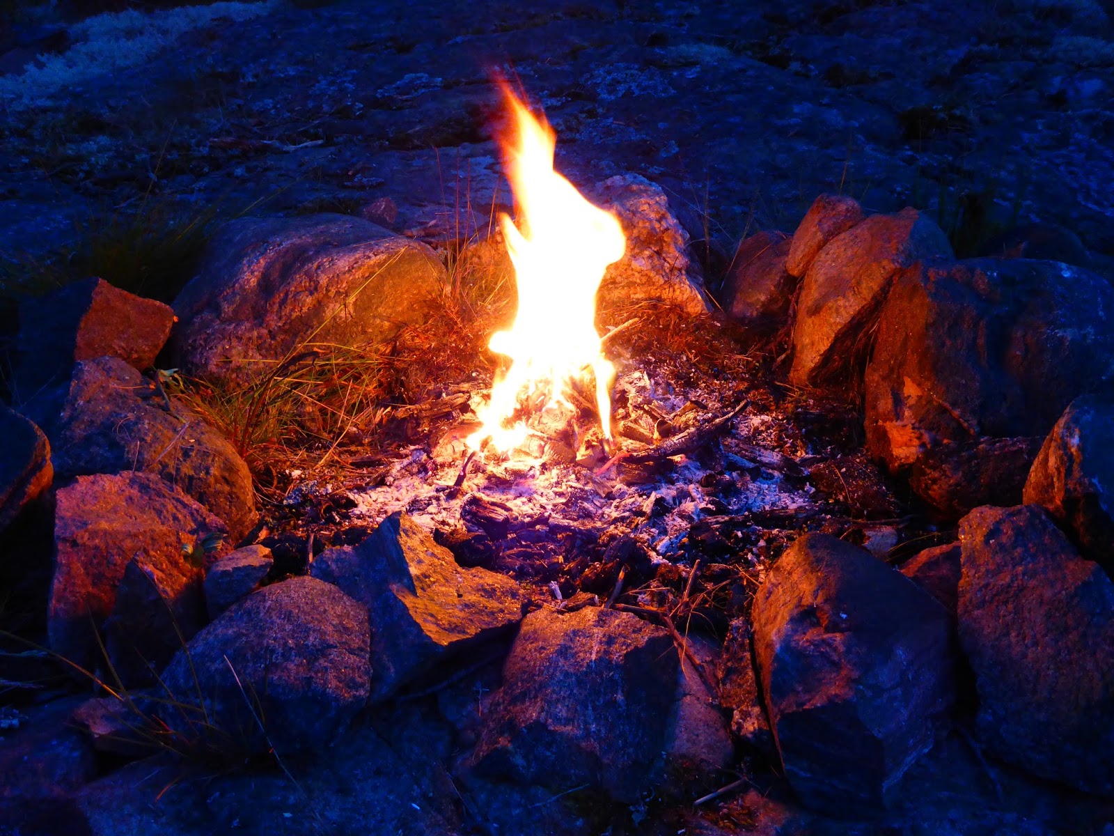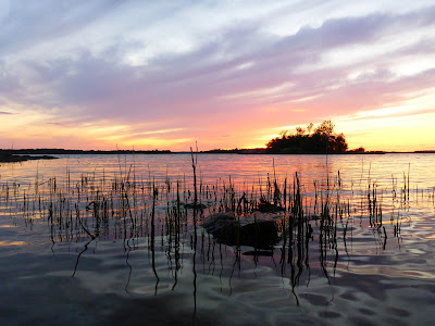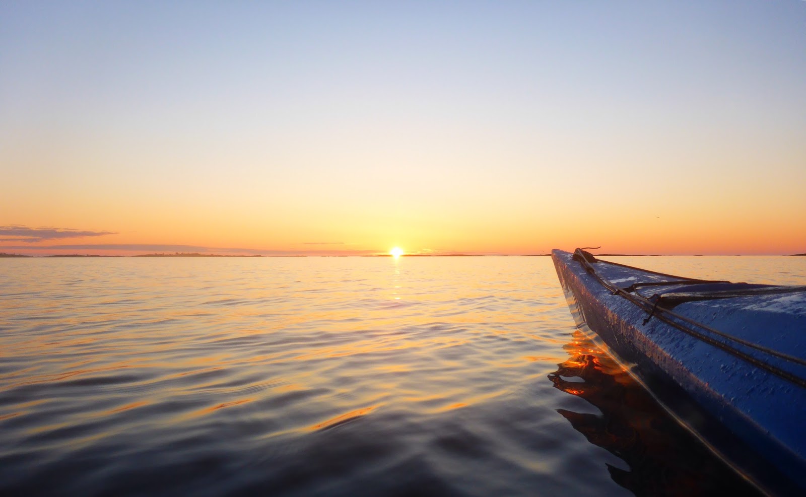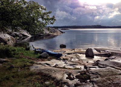 Då vaknar plötsligt allt till liv igen. Utanför har trutarna heta diskussioner, svanarna är oense om något och flaxar och skriker och morkullan knorrar förbi. När det lugnar ner sig börjar fiskarna med sitt plaskande då de jagar något på ytan. Till slut är det bara en mås som jamar envist och jag tror att nu lugnar det sig. Men inte då, tassande steg hörs utan för tältet, lätta fötter springer i skydd av mörkret, söker något att stoppa i munnen, kanske korvbiten jag la på ett strategiskt ställe. Tunga vingslag landar strax bredvid. Kvar blir sen några odefinierbara ljud som tillsammans med stilla vågskvalp lockar mig till söms…