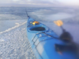 Efter en liten balansakt över iskanten så är jag på väg ut. Följer iskanten, vattnet stänker över kajaken och fryser till. Snart har Blå Rocker ett 5mm tjockt ispansar över sig och på paddelskaftet hänger det isklumpar.
