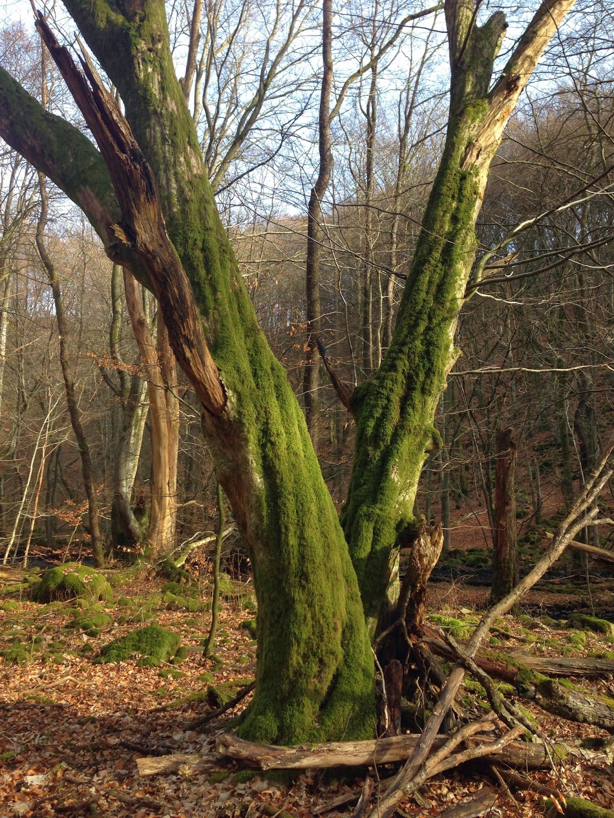 Stigarna är hjortarnas, marken är snårig och sakta slingrar jag mig fram. I bland följer jag en mossig stenmur, passerar någon ruin där bokskogen har tagit över herraväldet, i bland över ett sumpigt parti där ”vilddjuren” har bökat.