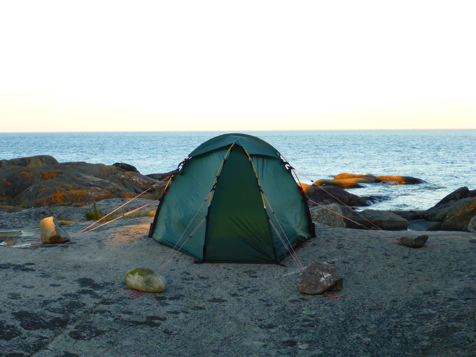 När gäspningarna kommer tätare kryper jag ändå in i tältet, som står en meter från havsytan, och när jag till slut ligger, med sovsäcken som täcke, slår det mig att detta blir den 19:e natten i tält denna semester 🙂