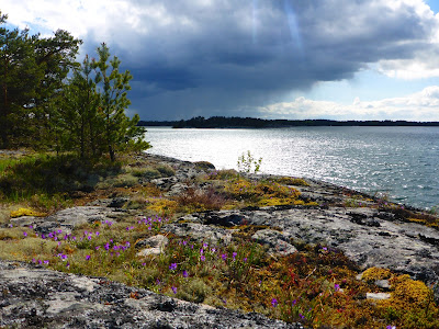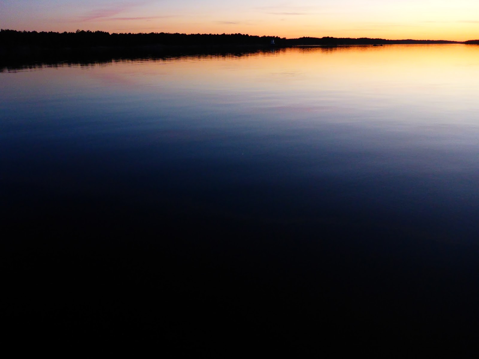 Då vaknar plötsligt allt till liv igen. Utanför har trutarna heta diskussioner, svanarna är oense om något och flaxar och skriker och morkullan knorrar förbi. När det lugnar ner sig börjar fiskarna med sitt plaskande då de jagar något på ytan. Till slut är det bara en mås som jamar envist och jag tror att nu lugnar det sig. Men inte då, tassande steg hörs utan för tältet, lätta fötter springer i skydd av mörkret, söker något att stoppa i munnen, kanske korvbiten jag la på ett strategiskt ställe. Tunga vingslag landar strax bredvid. Kvar blir sen några odefinierbara ljud som tillsammans med stilla vågskvalp lockar mig till söms…