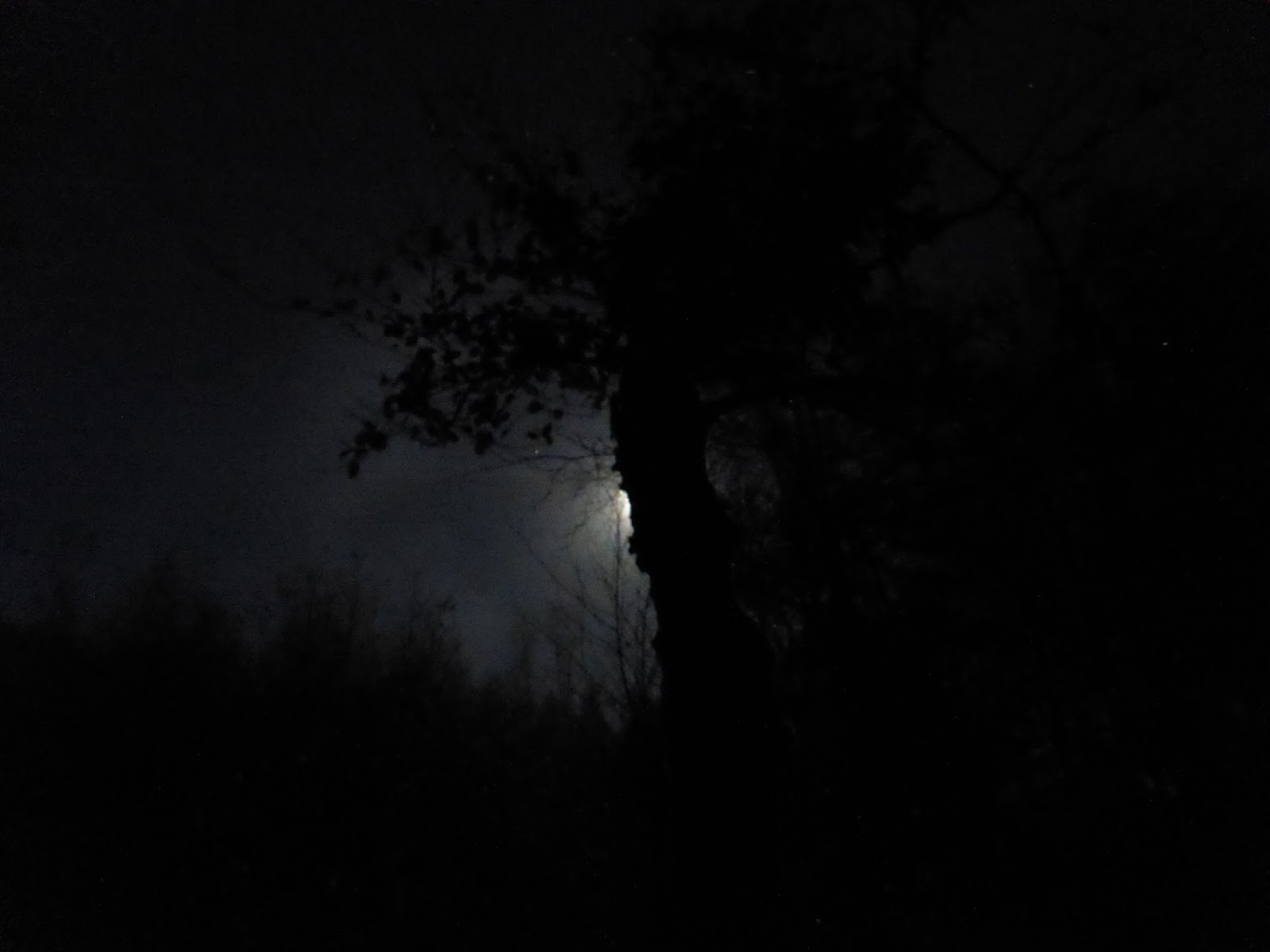 Stigen är bitvis månbelyst och bitvis helt mörk så jag växlar med att ha pannlampan tänd. Vandringen går långsamt fram förutom när jag kommer ut på nån skogsväg. Vid en krök bestämmer jag mig för att ta ut en kompassriktning över en ås, klädd med bokar och ekar, för att komma på en annan väg som ligger två km bort. Efter ett tag hör jag deras läten igen, nu tydligare. Men jag fortsätter sakta framåt medan jag hela tiden tar ut riktningen för att inte tappa bort mig. Skillnaden mot förut är att deras läten inte försvinner bort utan de blir starkare och starkare. När grymtandet plötsligt kommer från flera håll vänder jag tillbaka och väljer en annan rutt.